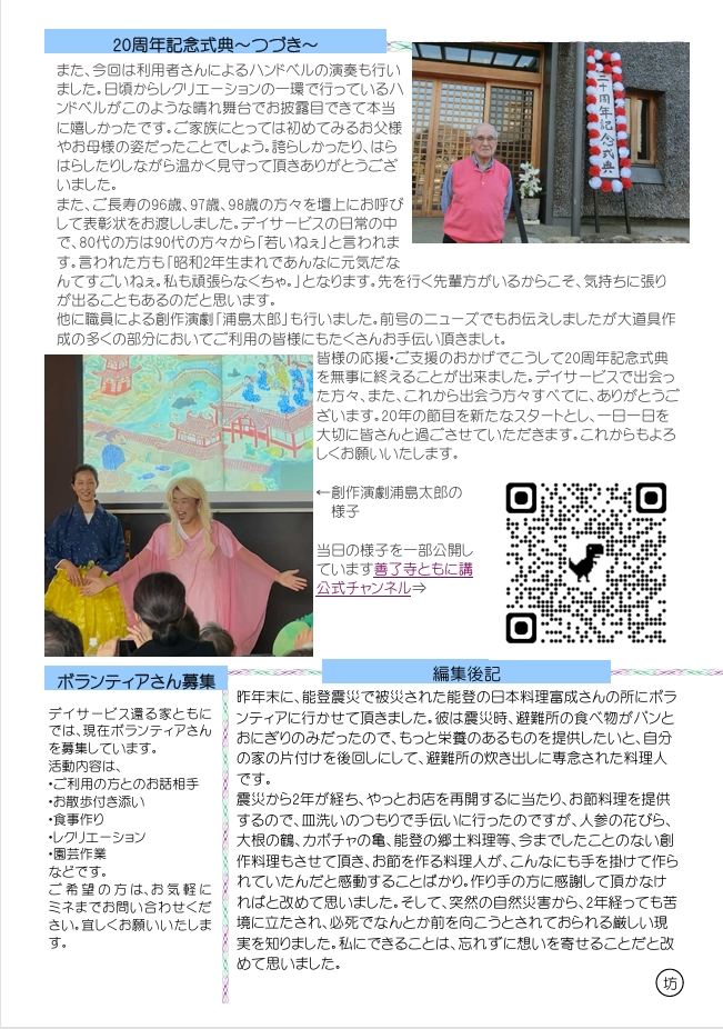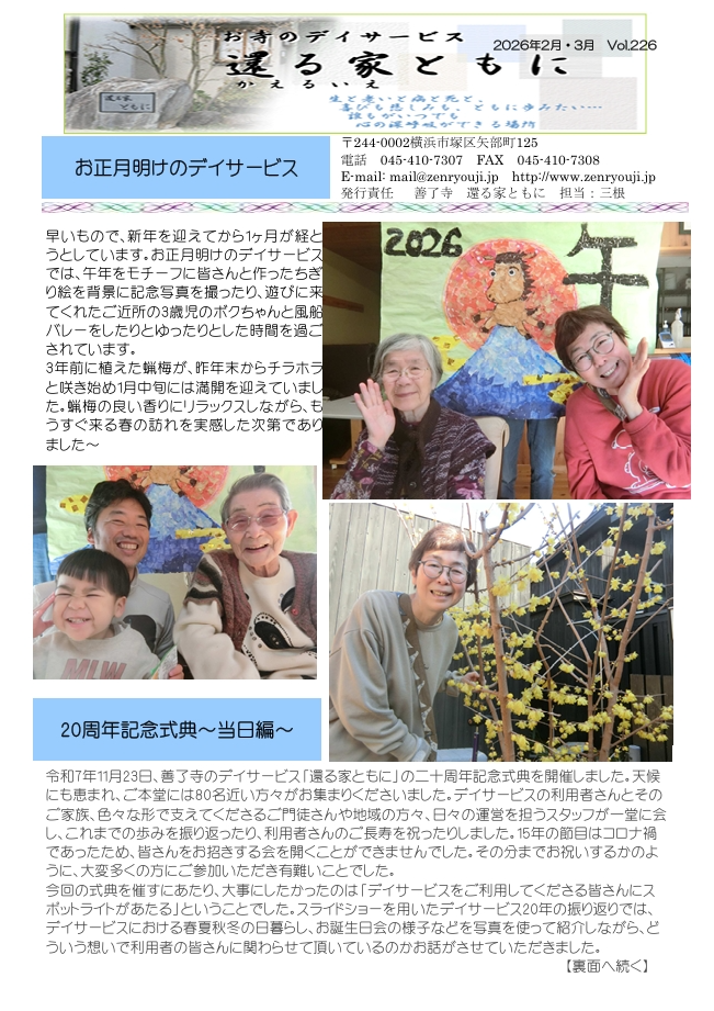 デイサービス情報 令和8年2月・3月 2026 2/05 デイサービス情報 トピックス URLをコピーしました! 能登半島地震奥能登豪雨災害被災者支援活動に参加して R8年2月.3月号 関連記事 ステキな七五三参り お寺でいかがですか? 2023年11月5日 <公式youtubeチャンネル>親鸞聖人と生きる 2023年11月24日 デイサービス情報 令和5年12月 2023年12月21日 デイサービス情報 令和5年11月 2023年12月21日 デイサービス情報 令和6年1月 2024年1月1日 デイサービス情報 令和6年2月 2024年2月1日 デイサービス情報 令和6年3月 2024年3月1日 デイサービス情報 令和6年4月 2024年4月1日
