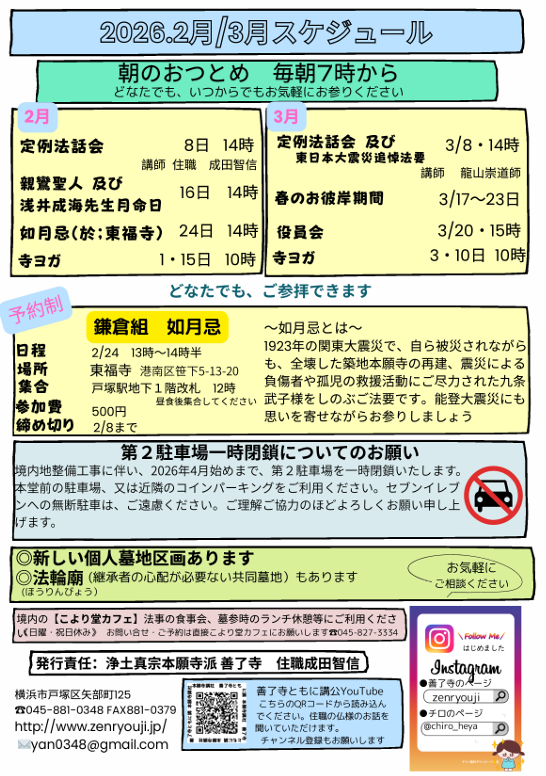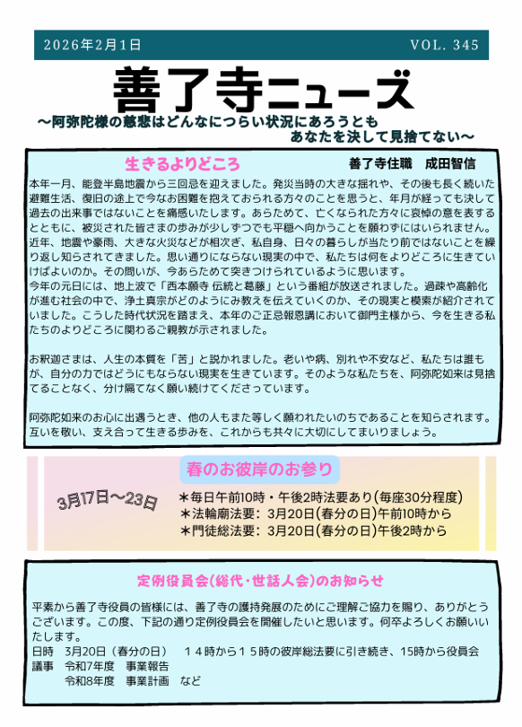 R8年2月.3月号 2026 2/03 トピックス 善了寺ニューズ URLをコピーしました! デイサービス情報 令和8年2月・3月 関連記事 ステキな七五三参り お寺でいかがですか? 2023年11月5日 2023年11月 行事予定 2023年11月5日 善 了 寺 ニ ュ ー ズ 2023年1 1 月 号 2023年11月6日 <公式youtubeチャンネル>親鸞聖人と生きる 2023年11月24日 善 了 寺 ニ ュ ー ズ 2023年12月 号 2023年12月4日 善 了 寺 ニ ュ ー ズ2024年 1月 号 2024年1月4日 善了寺ニューズ 2月号 2024年1月29日 善了寺ニューズ3月号 2024年3月1日